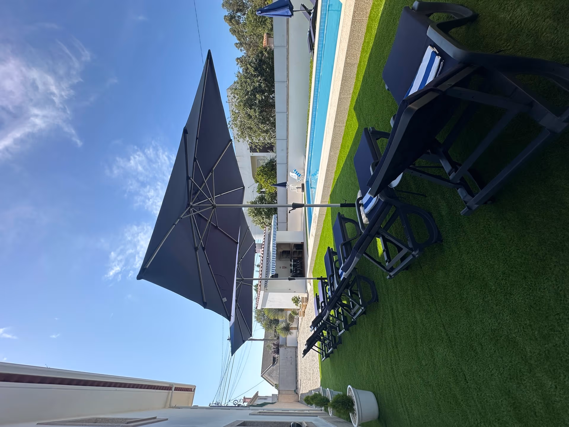 Piscina exterior e jardim privativo com vista relaxante para banhos de sol e momentos em família.